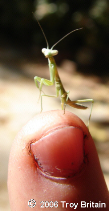 A praying mantis nymph, don't know the species. The thumb belongs to an uncle.