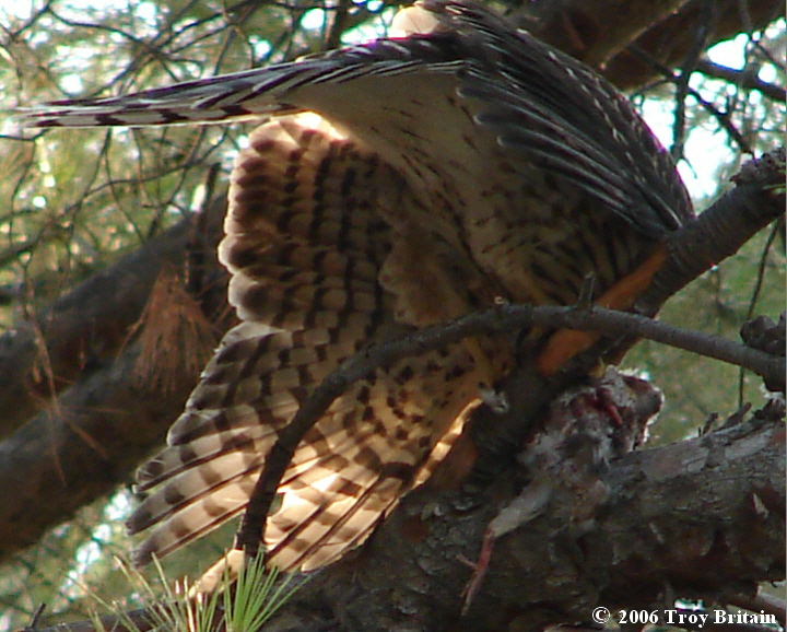 Some type of hawk (possibly a Cooper's) feeding on the remains of a smaller bird.